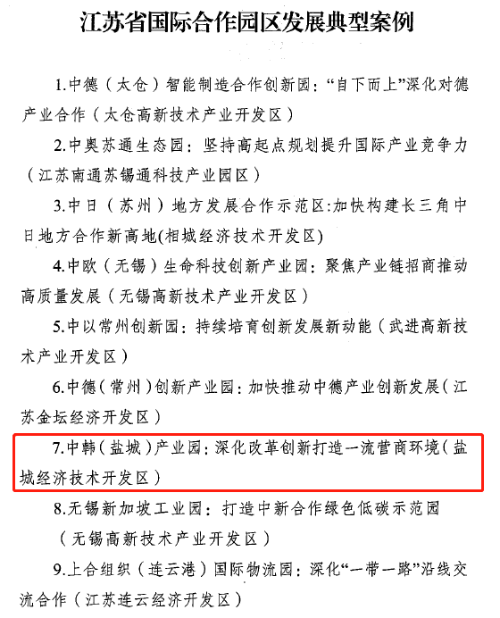 近日,江苏省商务厅选取创新性强、成效明显的9个省级国际合作园区,下发了《省商务厅关于印发江苏省国际合作园区发展案例的通知》(苏商开发〔2023〕330号),供各地学习借鉴。中韩(盐城)产业园深化改革创新打造一流营商环境案例成功入选。