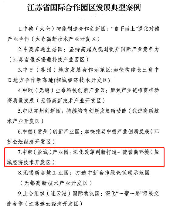 近日,江苏省商务厅选取创新性强、成效明显的9个省级国际合作园区,下发了《省商务厅关于印发江苏省国际合作园区发展案例的通知》(苏商开发〔2023〕330号),供各地学习借鉴。中韩(盐城)产业园深化改革创新打造一流营商环境案例成功入选。