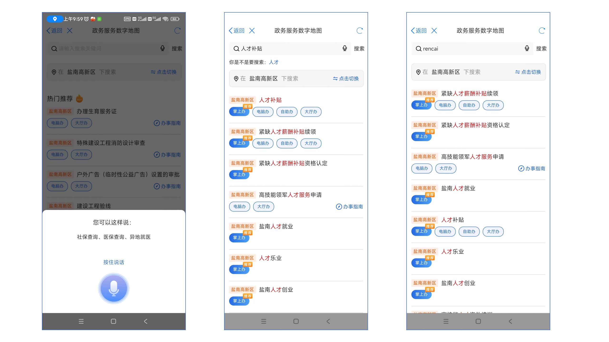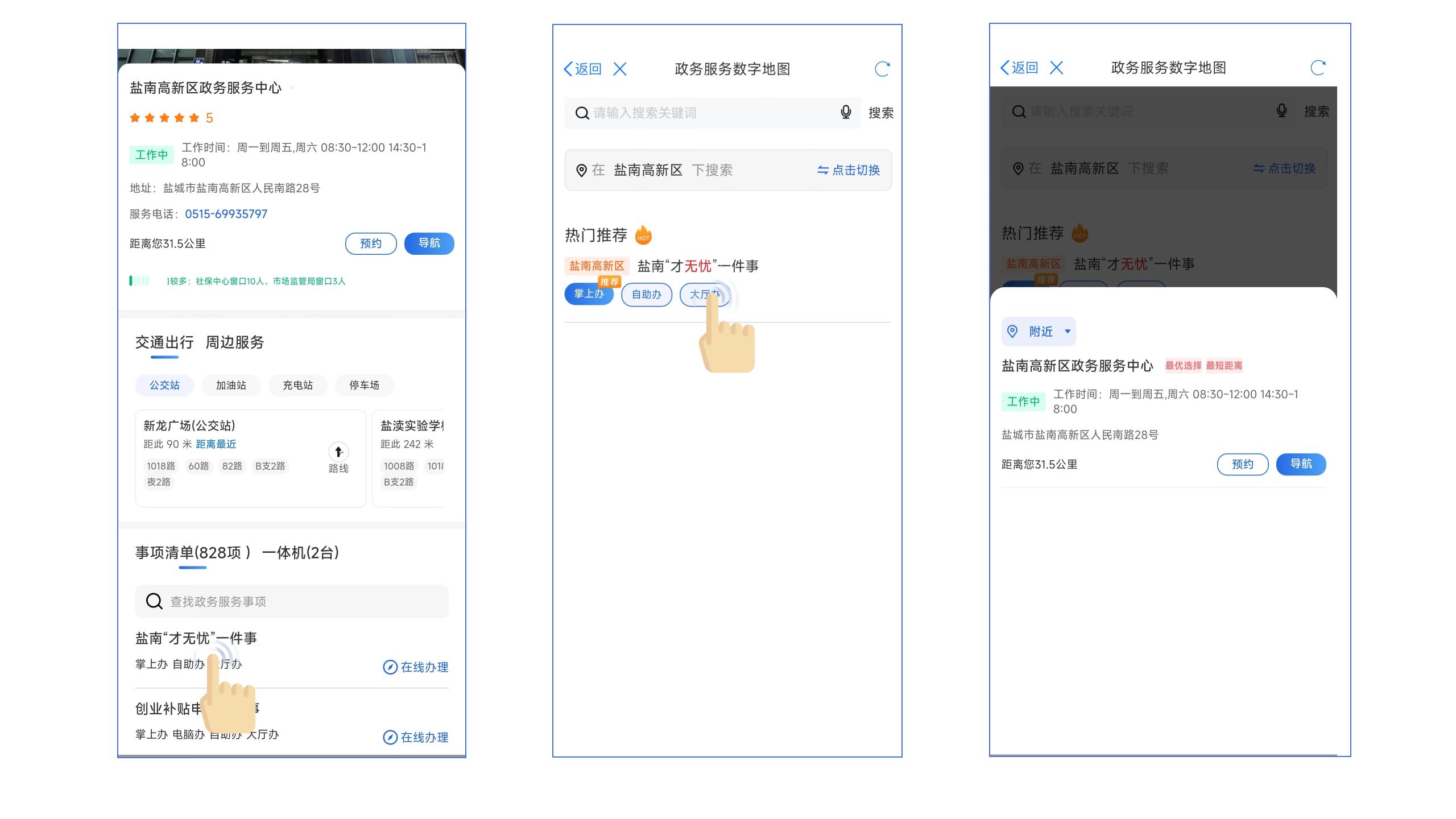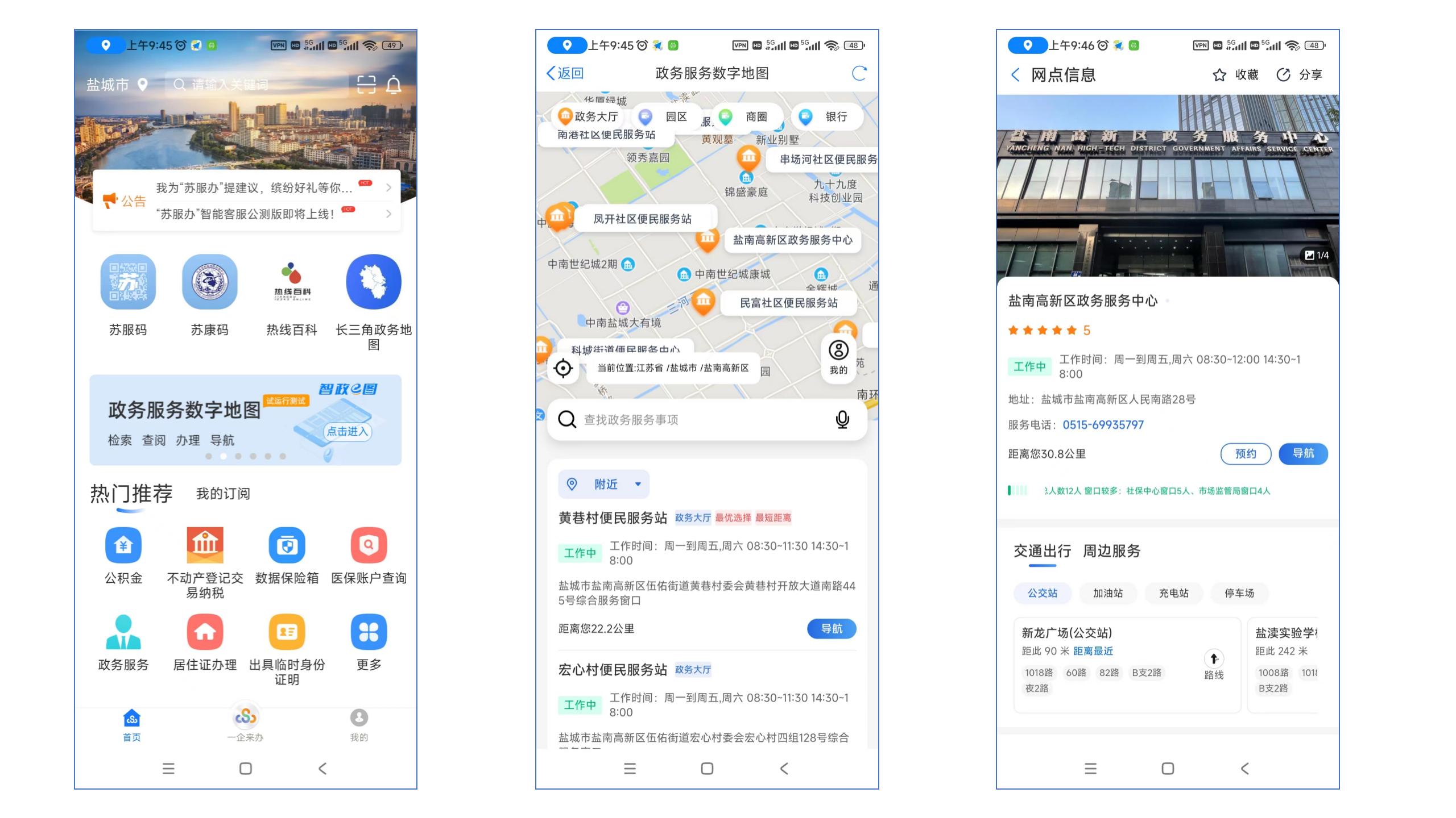 目前,数字地图已将盐城市政务服务大厅网点数据汇入平台,盐南高新区共接入市、县(市、区)、街道及社区四级政务服务网点60个,通过线上线下四端融合累计接入90个事项掌上办、615个事项就近办、120个事项联动办、20个“一件事”集成办、26个事项“长三角通办”,相关个人证照可随时、随地、随需打印。